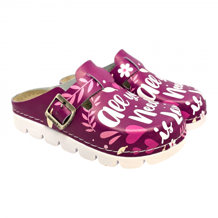 Sabotii medicali marca Dr.Feet modelul 1100 de culoare mov cu imprimeu dragut "All you need is love" (tot de ce ai nevoie este dragostea) este o combinatie perfecte intre ultimile tendinte al modei cu confortul sporit, oferindu-ți combinația perfectă de stil și confort atât acasă, la serviciu, cât și in cele mai aglomerate zile din viata ta. Fiind lucrati din piele naturala italiana de cea mai buna calitate, combina luxul, eleganta si durabilitate.