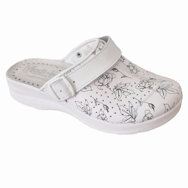 Sabotii Medi+ modelul 812 sb de culoare alba cu imprimeu de flori negre, este un model destinat persoanelor care isi doresc sa asigura picioarelor un confort pe masura la fiecare pas!